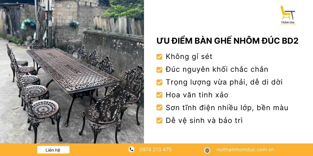 Để nhận báo giá chi tiết theo từng mẫu bàn ghế nhôm đúc, khách hàng vui lòng liên hệ trực tiếp với Nội Thất Trần Gia qua số hotline 0974 213 475.