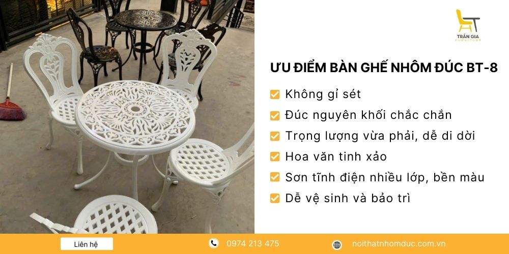 Để nhận báo giá chi tiết theo từng mẫu bàn ghế nhôm đúc, khách hàng vui lòng liên hệ trực tiếp với Nội Thất Trần Gia qua số hotline 0974 213 475.