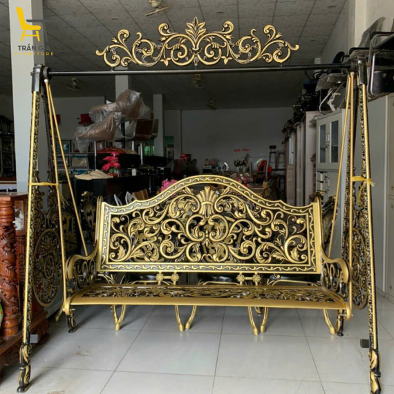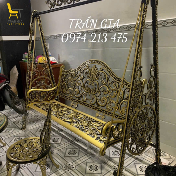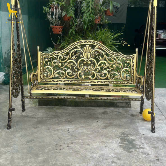 Một trong những điểm nổi bật của xích đu nhôm đúc là thiết kế hoa văn đúc liền khối mang phong cách cổ điển sang trọng. Các họa tiết uốn lượn mềm mại, đường nét tinh xảo kết hợp với màu sắc vàng và đen sang trọng giúp sản phẩm trở thành điểm nhấn đẹp mắt cho không gian. Xích đu đặc biệt phù hợp với sân vườn mang phong cách châu Âu, cổ điển hoặc bán cổ điển.